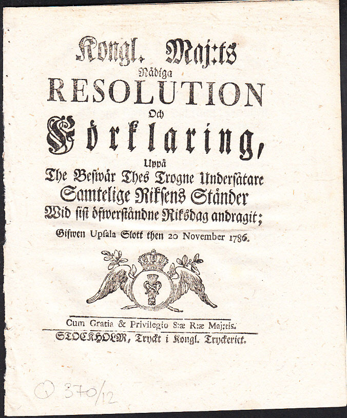 Kongl. maj:ts nådiga resolution och förklaring, uppå the beswär thes trogne undersåtare samtelige riksens ständer wid sist öfwerståndne riksdag andragit; gifwen Upsala slott then 20 november 1786.