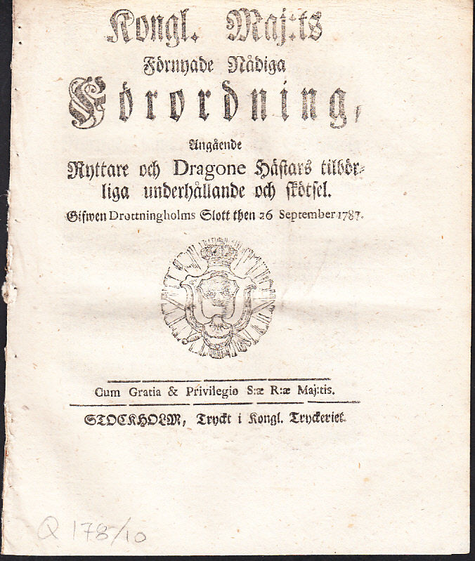 Kongl. Maj:ts Förnyade Nådiga Förordning, Angående Ryttare och Dragone Hästars tilbörliga underhållande och skötsel. Gifwen Drottningholms Slott then 26 September 1787.