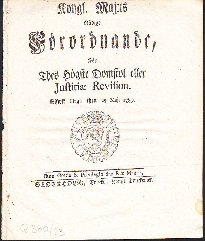 Kongl. Maj:ts Nådige Förordnande, För Thes Högste Domstol eller Justitæ Revision. Gifwit Haga then 15 Maji 1789.