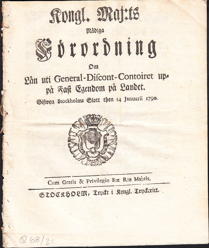 Kongl. Maj:ts Nådiga Förordning Om Lån uti General-Discont-Contoiret uppå Fast Egendom på Landet. Gifwen Stockholms Slott then 14 Januarii 1790.