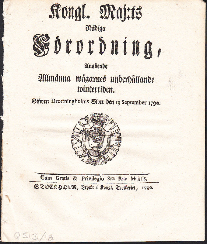 Kongl. Maj:ts Nådiga Förordning, Angående Allmänna wägarnes underhållande wintertiden. Gifwen Drottningholms Slott den 13 September 1790.