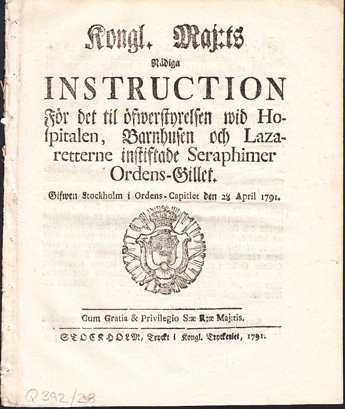 Kongl. maj:ts nådiga instruction för det til öfwerstyrelsen wid hospitalen, barnhusen och lazaretterne instiftade seraphimer ordens-gillet. Gifwet Stockholm i ordens-capitlet den 28 april 1791.