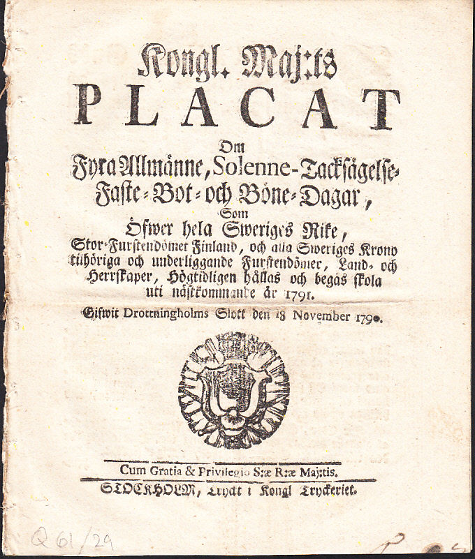 Kongl. Maj:ts Placat Om Fyra Allmänne, Solenne- Tacksägelse- Faste- Bot- och Böne-Dagar, Som Öfwer hela Sweriges Rike, Stor-Furstendömet Finland, och alla Sweriges Krono tilhöriga och underliggande Furstendömer, Land- och Herrskaper, Högtidligen hållas och begås skola uti nästkommande år 1791. Gifwit Drottningholms Slott den 18 November 1790.