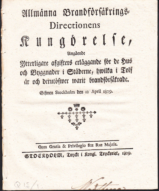 Allmänna Brandförsäkrings-Directionens Kungörelse, Angående Ytterligare afgifters erläggande för de Hus och Byggnader i Städerne, hwilka i Tolf år och derutöfwer warit brandförsäkrade. Gifwen Stockholm den 12 April 1809.