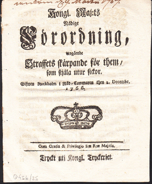 Kongl. Maj:ts Nådige Förordning, Angående Straffets skärpande för them, som stjäla utur fickor. Gifwen Stockholm i Råd-Cammaren then 2. Decembr. 1766.