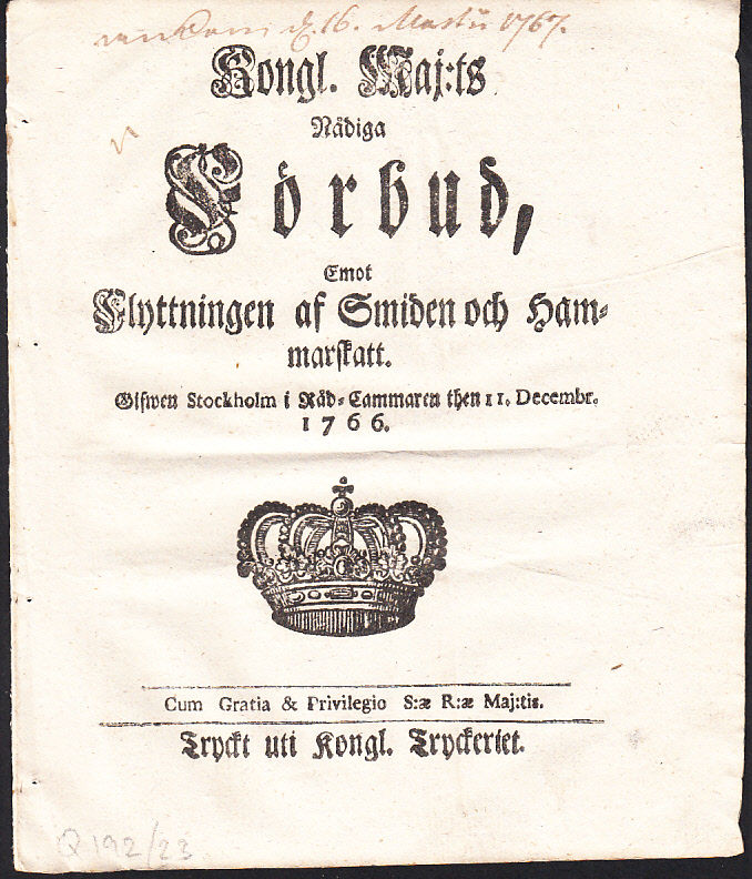 Kongl. Maj:ts Nådiga Förbud, Emot Flyttningen af Smiden och Hammarskatt. Gifwen Stockholm i Råd-Cammaren then 11. Decembr. 1766.