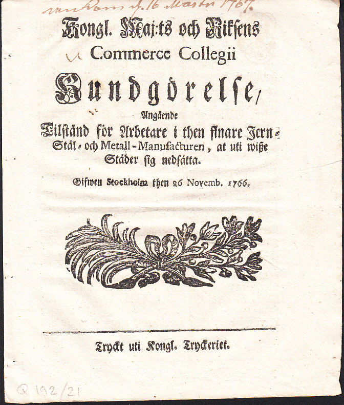 Kongl. Maj:ts och Riksens Commerce Collegii Kundgörelse, Angående Tilstånd för Arbetare i then finare Jern- Stål- och Metall-Manufacturen, at uti wisze Städer sig nedsätta. Gifwen Stockholm then 26 Novemb. 1766.
