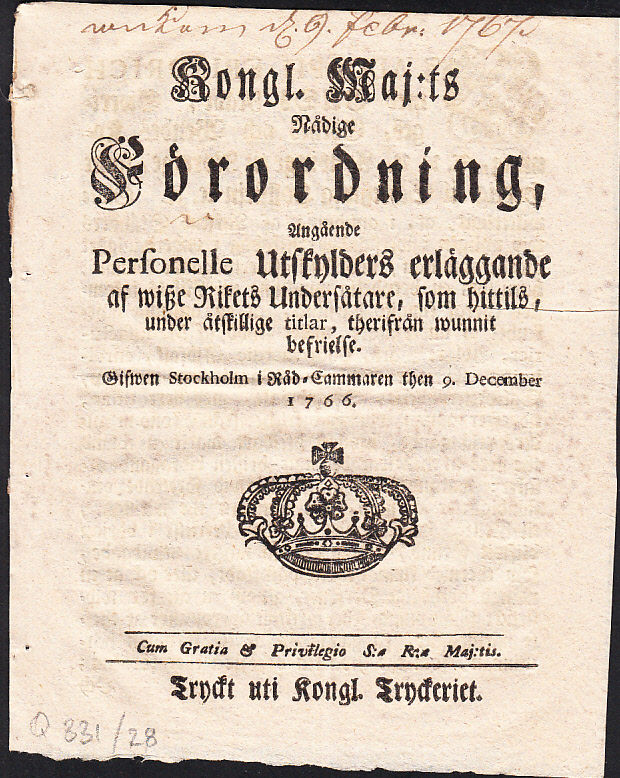 Kongl. Maj:ts Nådige Förordning, Angående Personelle Utskylders erläggande af wisze Rikets Undersåtare, som hittils, under åtskillige titlar, therifrån wunnit befrielse. Gifwen Stockholm i Råd-Cammaren then 9. December 1766.