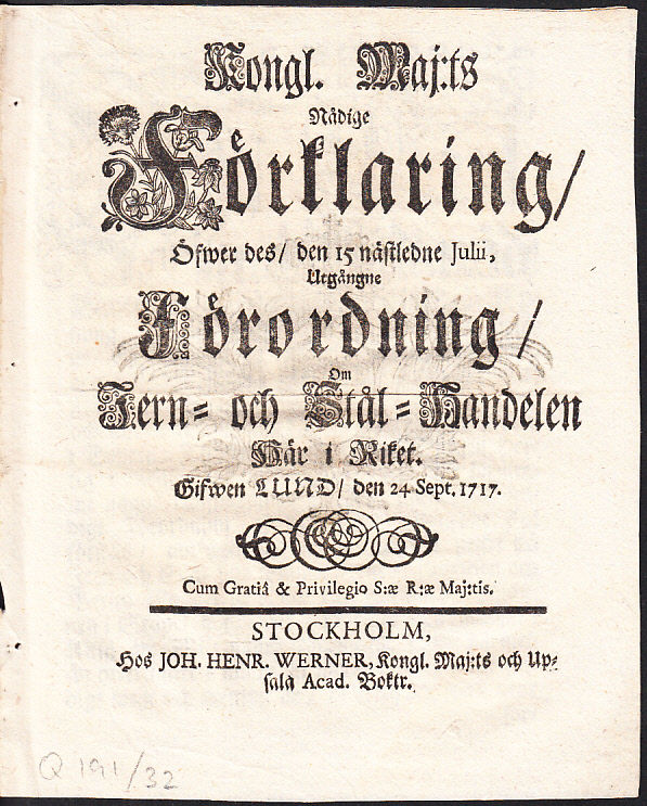 Kongl. maj:ts nådige Förklaring, Öfwer des, den 15 nästledne Julii, Utgångne Förordning, Om Jern- och Stål-Handelen Här i Riket. Gifwen Lund, den 24 sept. 1717.