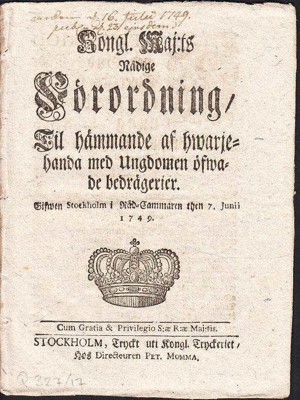 Kongl. Maj:ts Nådige Förordning, Til hämmande af hwarjehanda med Ungdomen öfwade bedrägerier. Gifwen Stockholm i Råd-Cammaren then 7. Junii 1749.