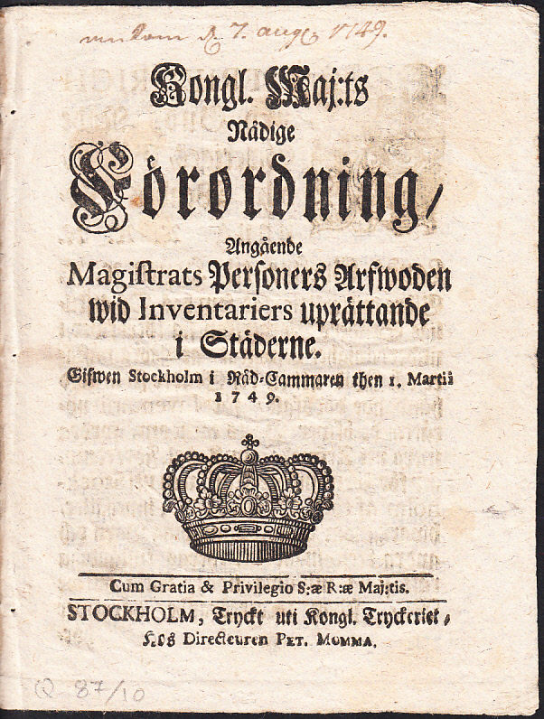 Kongl. Maj:ts Nådige Förordning, Angående Magistrats Personers Arfwoden wid Inventariers uprättande i Städerne. Gifwen Stockholm i Råd-Cammaren then 1. Martii 1749.
