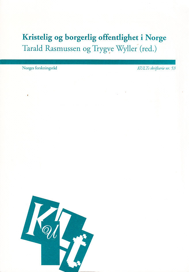 KULTs skriftserie nr 53. Innehåll: Kristelig og borgerlig offentlighet i Norge på 1800-tallet, av Tarald Rasmussen; For leg og lærd - en oversikt over norske kristelige tidsskrifter, 1800-1895, av Jørund Midttun; Indeks over samtlige tidsskrifter, av Jørund Midttun; En oversikt over antall tidsskrift i de forskjellige gruppene fra 1850-95, av Jørund Midttun; Seksualmoral og samfunnsmoral. Konkurrerende diskurser i sedelighetsdebatten, av Gro Hagemann; Ronald Fangen og arbeidet for en ny kristelig offentlighet, av Per Anders Aas; Kommentarer til Per Anders Aas: overideologier, mellomposisjoner og intimisering, av Pål Repstad; Den postmoderne offentlighet og kirken, av Dag Norheim; Kommentar till Dag Norheim: Muligheten for en moralsk offentlighet i det postmoderne Norge, av Knut Lundby.