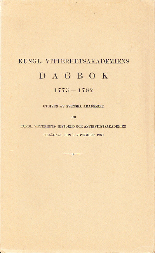 Kungl. Vitterhetsakademiens dagbok 1773-1782. Utgiven av Svenska akademien och Kungl. vitterhets-, historie- och antikvitets-akademien tillägnad den 6 november 1930.