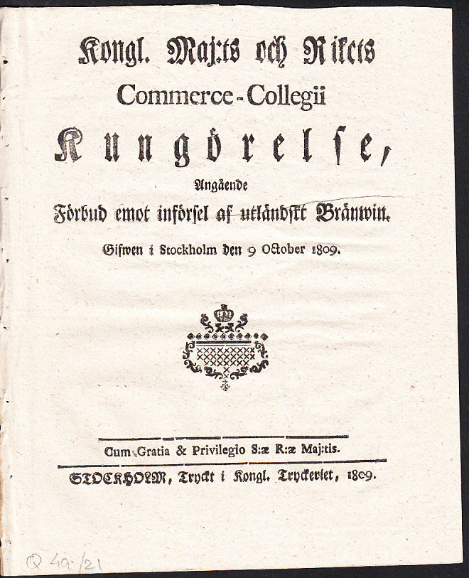 Kongl. Maj:ts och Rikets Commerce-Collegii Kungörelse, Angående Förbud emot införsel af utländskt Bränwin. Gifwen i Stockholm den 9 October 1809.