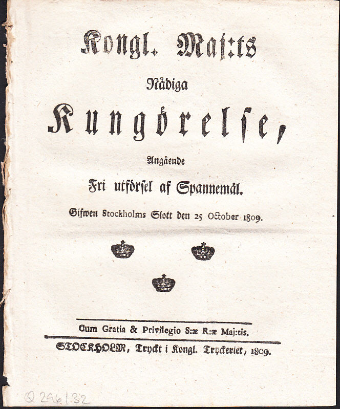 Kongl. Maj:ts Nådiga Kungörelse, Angående Fri utförsel af Spannemål. Gifwen Stockholms Slott den 25 October 1809.