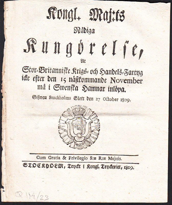 Kongl. Maj:ts Nådiga Kungörelse, At Stor-Britanniske Krigs- och Handels-Fartyg icke efter den 15 nästkommande November må i Swenska Hamnar inlöpa. Gifwen Stockholms Slott den 27 October 1809.