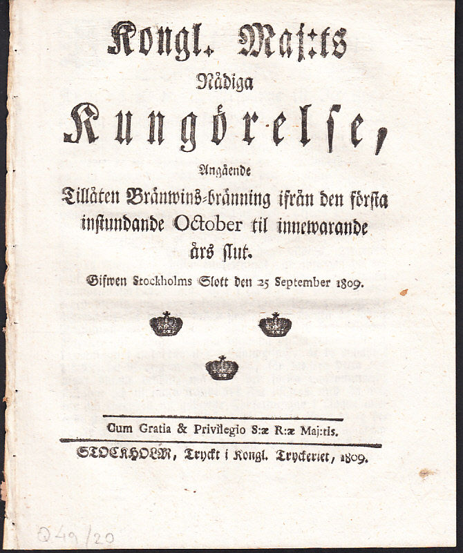 Kongl. Maj:ts Nådiga Kungörelse, Angående Tillåten Bränwins-bränning från den första instundande October til innewarande års slut. Gifwen Stockholms Slott den 25 September 1809.