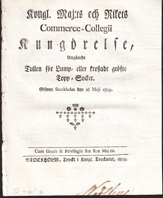 Kongl. Maj:ts och Rikets Commerce-Collegii Kungörelse, Angående Tullen för Lump- eller kroszadt gröfre Topp-Socker. Gifwen Stockholm den 16 Maji 1809.