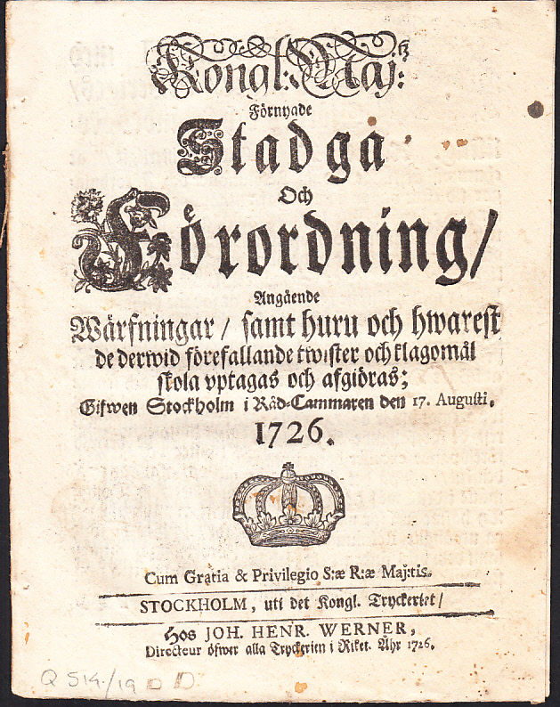 Kongl. maj:tz Förnyade Stadga Och Förordning, Angående Wärfningar, samt huru och hwarest de derwid förefallande twister och klagomål skola uptagas och afgiöras. Gifwen Stockholm i Råd-cammaren den 17. augusti, 1726.