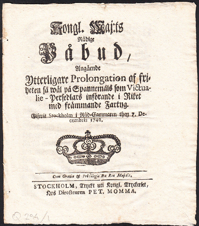 Kongl. Maj:ts Nådige Påbud, Angående Ytterligare Prolongation af friheten så wäl på Spannemåls som Victualie-Persedlars införande i Riket med främmande Fartyg. Gifwen Stockholm i Råd-Cammaren then 7. Decembris 1742.