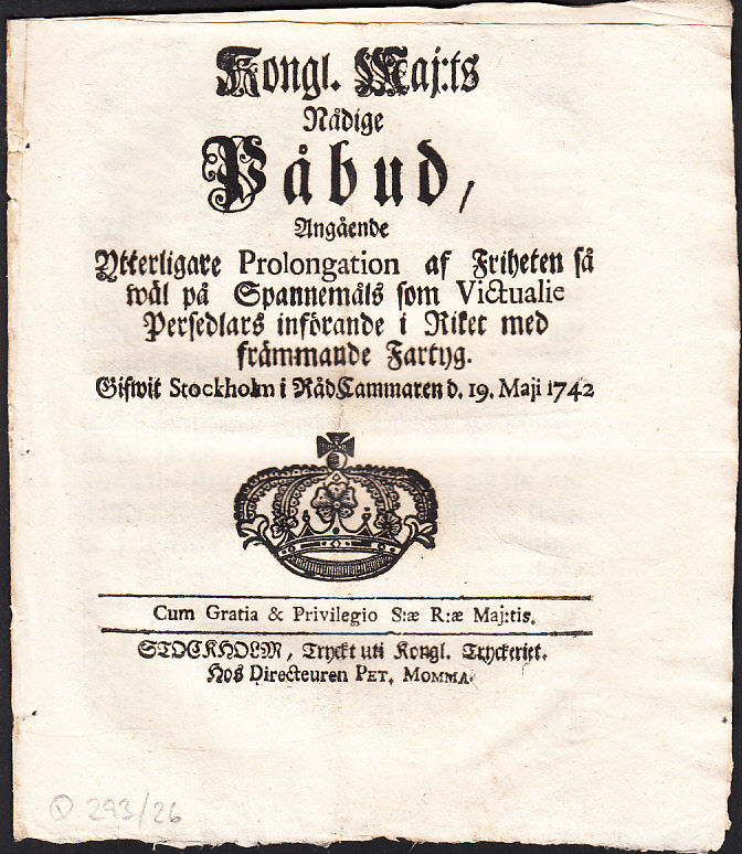 Kongl. Maj:ts Nådige Påbud, Angående Ytterligare Prolongation af Friheten så wäl på Spannemåls som Victualie Persedlars införande i Riket med främmande Fartyg. Gifwit Stockholm i RådCammaren d. 19. Maji 1742.