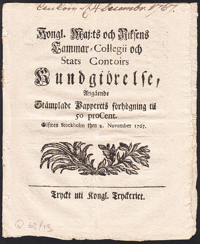 Kongl. Maj:ts och Riksens Cammar-Collegii och Stats Contoirs Kundgiörelse, Angående Stämplade Papperets förhögning til 50 proCent. Gifwen Stockholm then 2. November 1767.