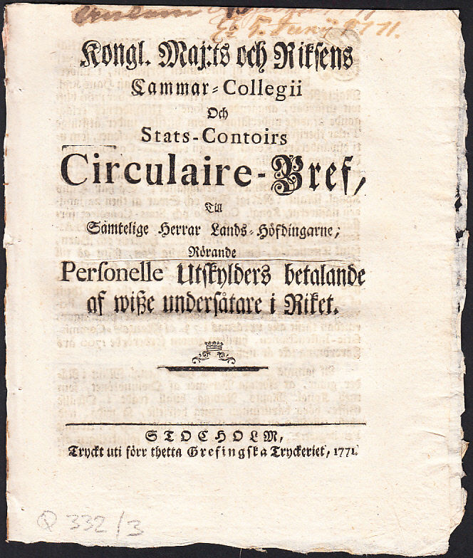 Kongl. maj:ts och Riksens Cammar-Collegii och Stats-Contoirs Circulaire-Bref, Till Samtelige Herrar Lands-Höfdingarne, Rörande Personelle Utskylders betalande af wisze undersåtare i Riket.