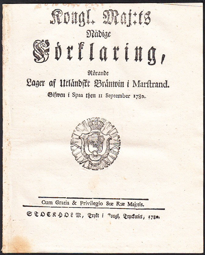 Kongl. Maj:ts Nådige Förklaring, Rörande Lager af Utländskt Bränwin i Marstrand. Gifwen i Spaa then 11 September 1780.
