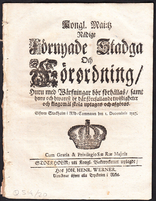 Stockholm, uti Kongl. boktryckeriet uplagdt, hos Joh. Henr. Werner. directeur öfwer alla tryckerien i riket, [1727]. 4:o. (12) s. Med graverad titelvinjett. Tagen ur band. Ytterst lätt lagerfläckad.