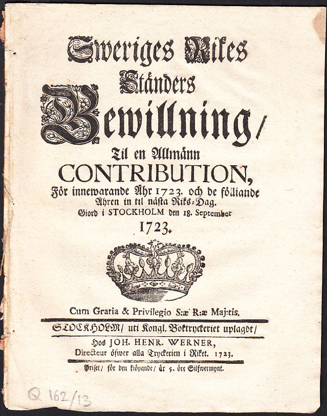Sweriges rikes ständers bewillning, til en allmänn contribution, för innewarande åhr 1723. och de fölliande åhren in til nästa riks-dag. Giord i Stockholm den 18. september 1723.
