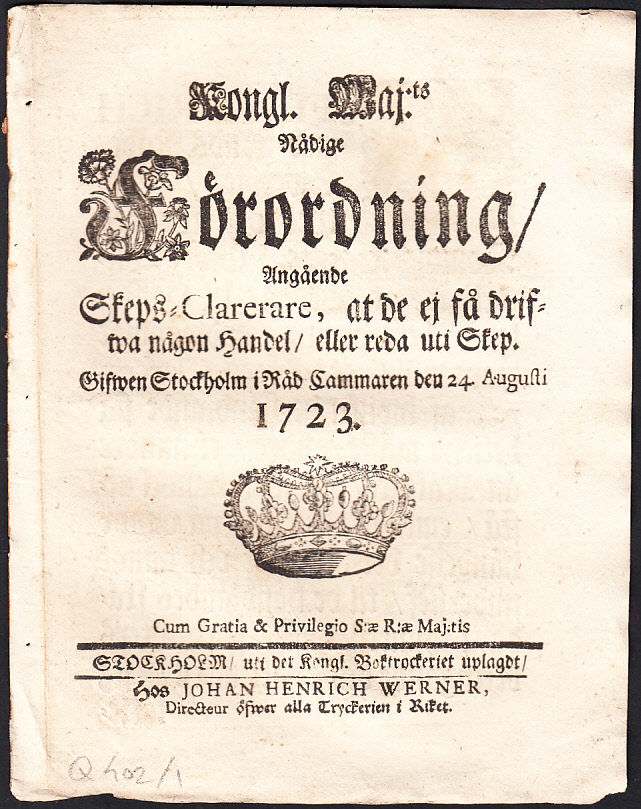 Kongl. Maj:ts Nådige Förordning, Angående Skeps-Clarerare, at de ej få drifwa någon Handel, eller reda uti Skep. Gifwen Stockholm i Råd Cammaren den 24. Augusti 1723.