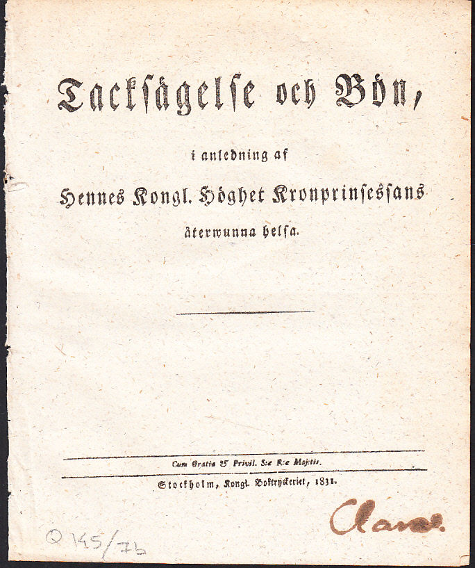 Tacksägelse och Bön, i anledning af Hennes Kongl. Höghet Kronprinsessans återwunna helsa.