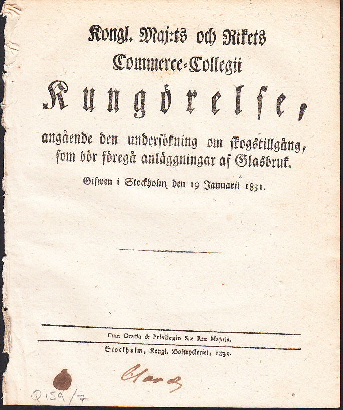 Kongl. maj:ts och Rikets Commerce-collegii Kungörelse, angående den undersökning om skogstillgång, som bör föregå anläggningar af Glasbruk. Gifwen i Stockholm den 19 januarii 1831.