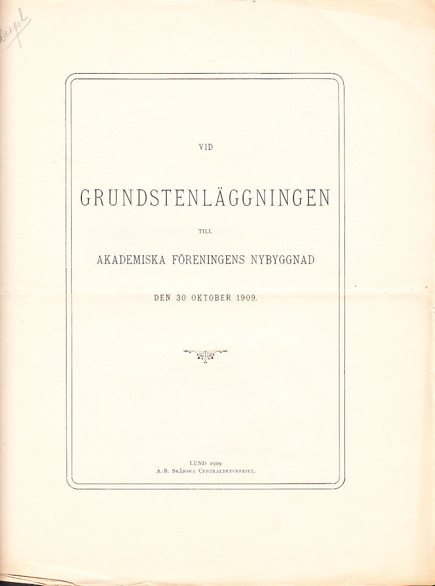 Lund, A.-B. Skånska Centraltryckeriet, 1909. 4:o. (4) s. Vikt ark. Antydan till tvärgående vikmärke, lite tilltuffsad nedre marginal. Enstaka marginalriss förekommer.