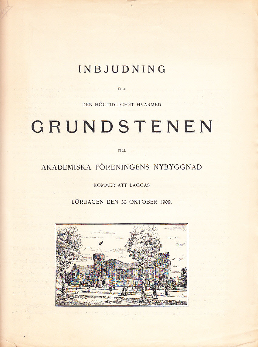 Inbjudan till den högtidlighet hvarmed grundstenen till Akademiska Föreningens nybyggnad kommer att läggas lördagen den 30 oktober 1909.