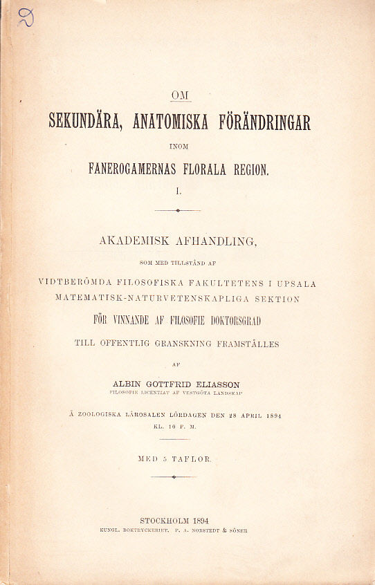 Om sekundära, anatomiska förändringar inom fanerogamernas florala region af A. G. Eliasson. Med 5 taflor. Meddelat den 7 juni 1893, genom F.R. Kjellman.