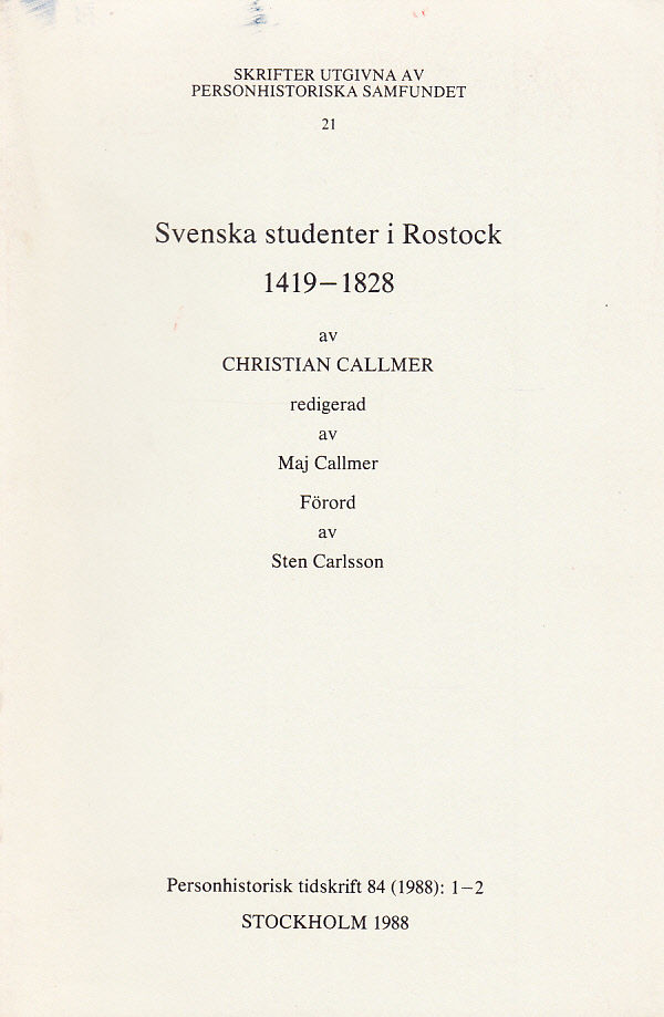 Svenska studenter i Rostock 1419-1828. Redigerad av Maj Callmer. Förord av Sten Carlsson. [= PHT 84, 1988:1-2].
