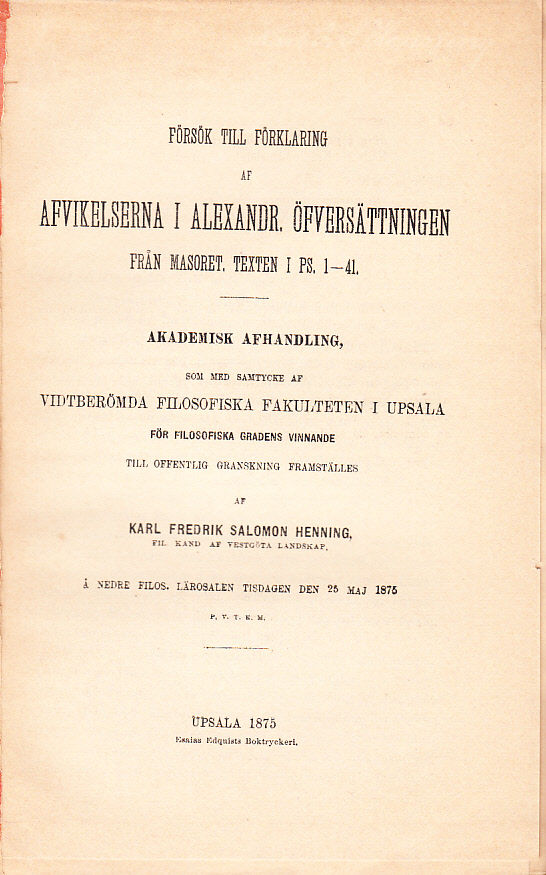 Försök till förklaring af afvikelserna i alexandr. öfversättningen från masoret. texten i Ps. 1-41.Akademisk afhandling ... af Karl Fredrik Salomon Henning ...