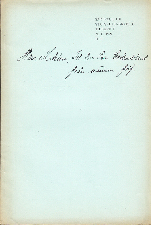 Lund, Håkan Ohlssons Boktryckeri, 1925. 8:o. s. [394]-423. Klammerhäftad med styvt tryckt ljusblått pappersomslag. Tillskrift ‘Herr Lektorn, Fil D:r Sven Cederblad / från vännen förf.’ på främre omslaget. Ur Claes Westerlunds boksamling.