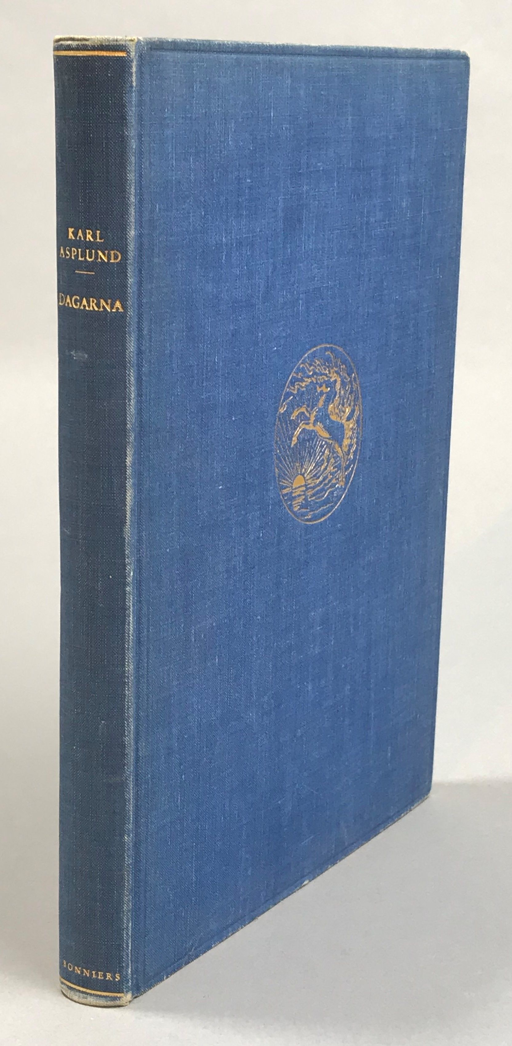Första upplagan. Löst bilagt är 2 maskinskrivna blad med rubriken: Karl Asplund: Valda dikter till komplettering av urvalet ‘Dagarna’. Två lösa tidningsklipp (Dikter av Asplund) införda i Sv.D. 1951 & 1954.