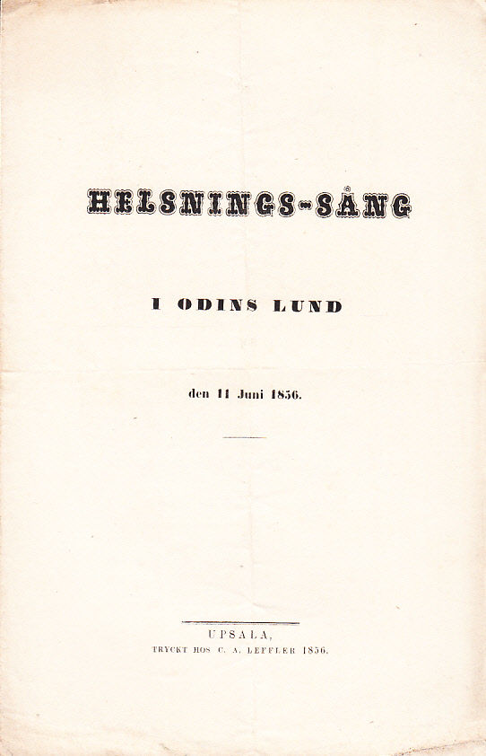 Upsala, tryckt hos C.A. Leffler, 1856. 8:o. (4) s. Vikt, lätt nött ark. Antydan till tvär- & längsgående vikmärke. Sista sidan något nött och solkig.