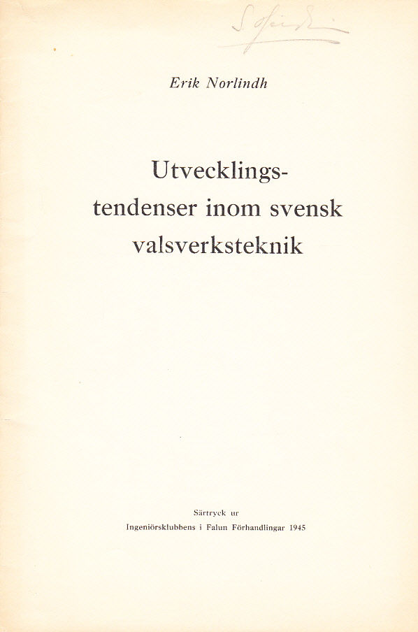 [Falun], Falu Nya Boktryckeri A.-B., [1945]. 8:o. 34 s. Illustrerad. Klammerhäftad med styvt tryckt ljusgult pappersomslag. Tillskrift ‘Överingenjör Sven Hjerdin / Med tack för angenäm samvaro / Förf.’ på främre omslagets insida. Namnteckning ‘S. Hjerdin’ på främre omslaget.