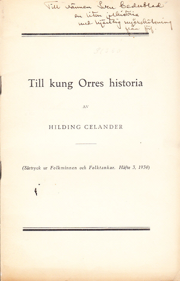 [Göteborg, Elanders Boktryckeri Aktiebolag, 1934]. 8:o. s. 117-142. Klammerhäftad med styvt tryckt, något nött ljusgult pappersomslag. Tillskrift ‘Till vännen Sven Cederblad / en liten julhistoria / med hjärtlig nyårshälsning / från förf.’ på främre omslaget. Ur Claes Westerlunds boksamling.