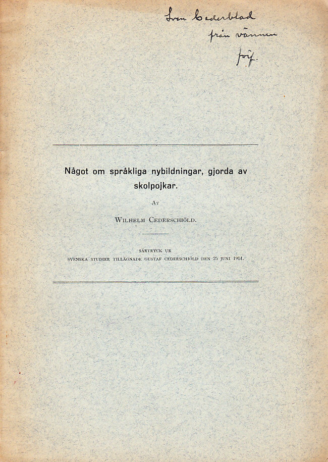 Lund, Berlingska Boktryckeriet, 1914. 8:o. s. [119]-128. Limhäftad med tryckt grått pappersomslag. Tillskrift ‘Sven Cederblad / från vännen / förf.’ på främre omslaget. Ur Claes Westerlunds boksamling.