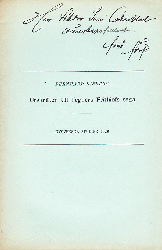 Uppsala, Appelbergs Boktryckeri Aktiebolag, 1926. 8:o. s. [131]-196. Trådhäftad med styvt tryckt ljusgrönt pappersomslag. Tillskrift ‘Till Herr Lektor Sven Cederblad / vänskapsfullast från förf.’ på främre omslaget. Ur Claes Westerlunds boksamling.