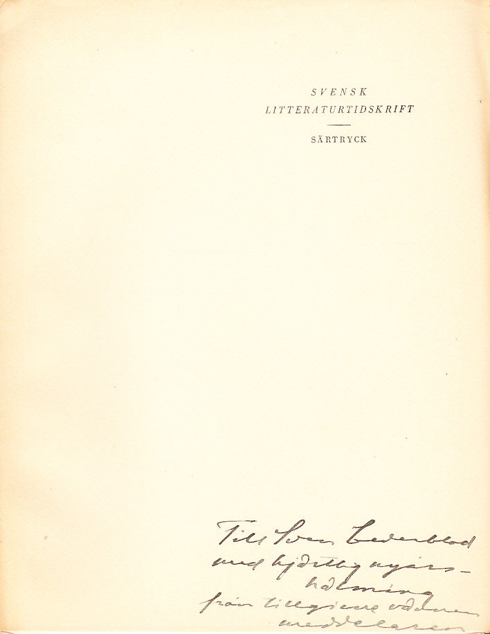 Särtryck ur ‘Svensk Litteraturtidskrift’. Sven Cederblad (1890-1956), litteraturvetare, vars främsta insats var hans arbeten om Erik Johan Stagnelius, som avhandlingen ‘Studier i Stagnelii romantik’ (1923) och biografin ‘Stagnelius och hans omgivning’ (1936). Han har även skrivit om poeter som Thomas Thorild, Esaias Tegnér, Erik Sjöberg och Gustaf Fröding. Han bidrog också till Studentföreningen Verdandis småskrifter och tidskriften Samlaren.