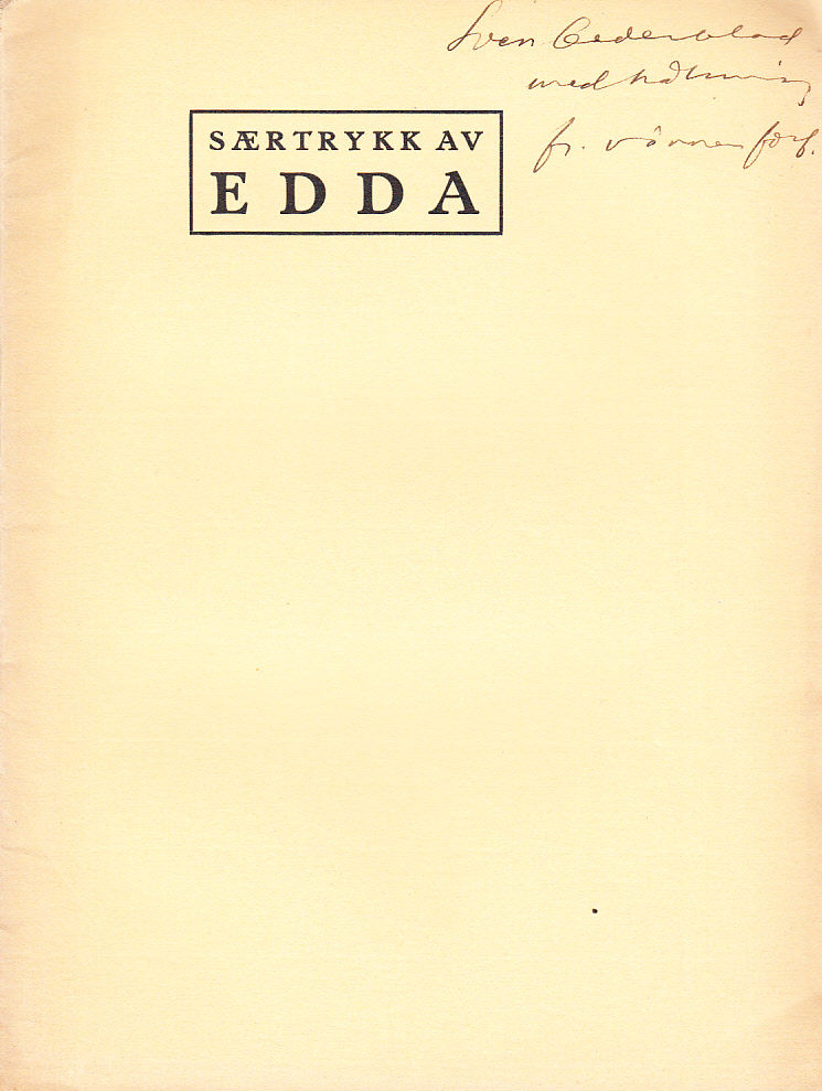 [Oslo, 1931]. 8:o. s. 328-350. Klammerhäftad med styvt tryckt, lätt nött, ljusgult pappersomslag. Tillskrift ‘Sven Cederblad / med hälsning / fr. vännen förf.’ på främre omslaget. Ur Claes Westerlunds boksamling.
