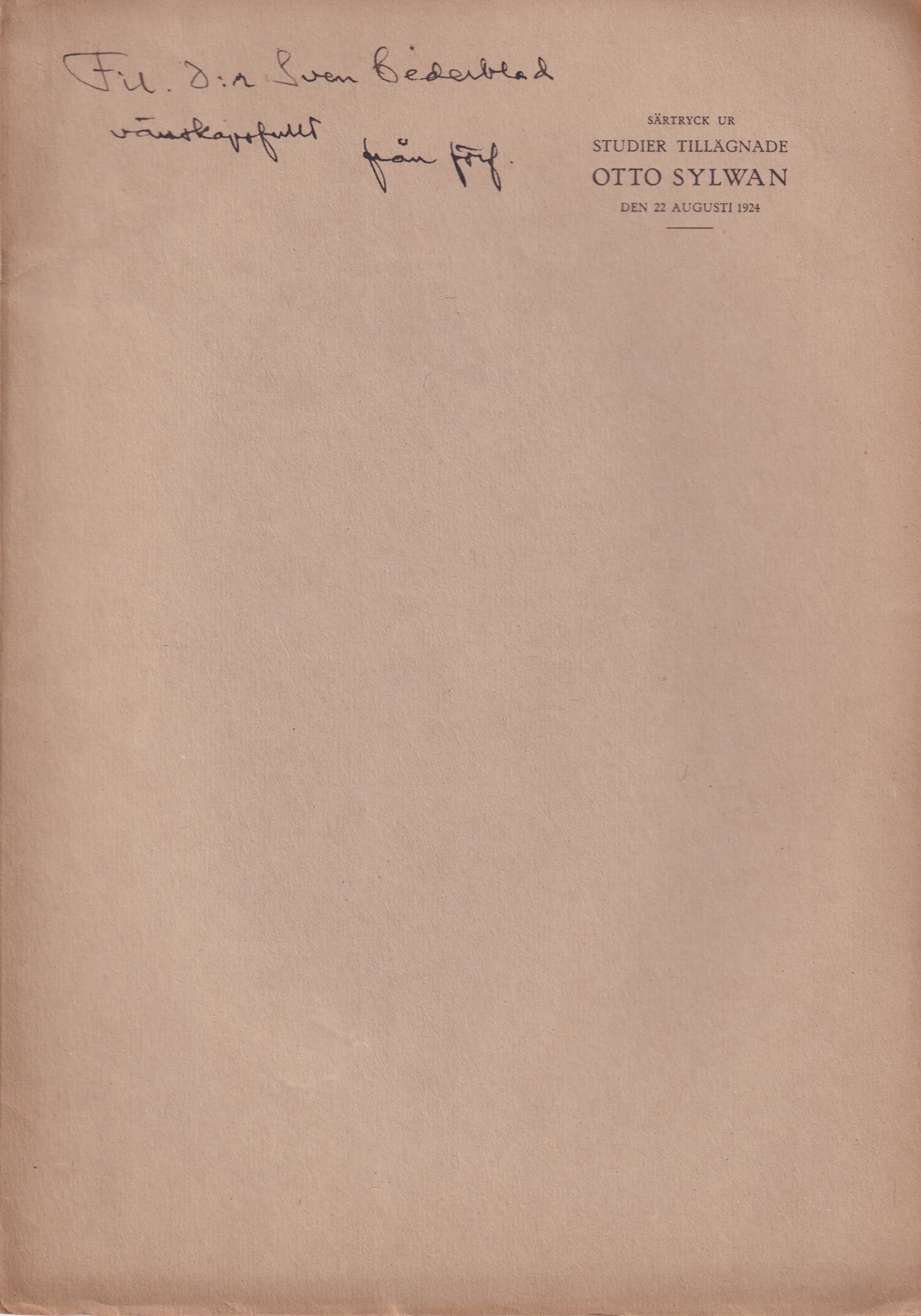 Göteborg, Elanders Boktryckeri A.-B., 1924. 8:o. s. [131]-152. Trådhäftad med styvt tryckt grått pappersomslag. Tillskrift ‘Fil. d:r Sven Cederblad / vänskapsfullt från förf.’ på främre omslaget. Ur Claes Westerlunds boksamling.