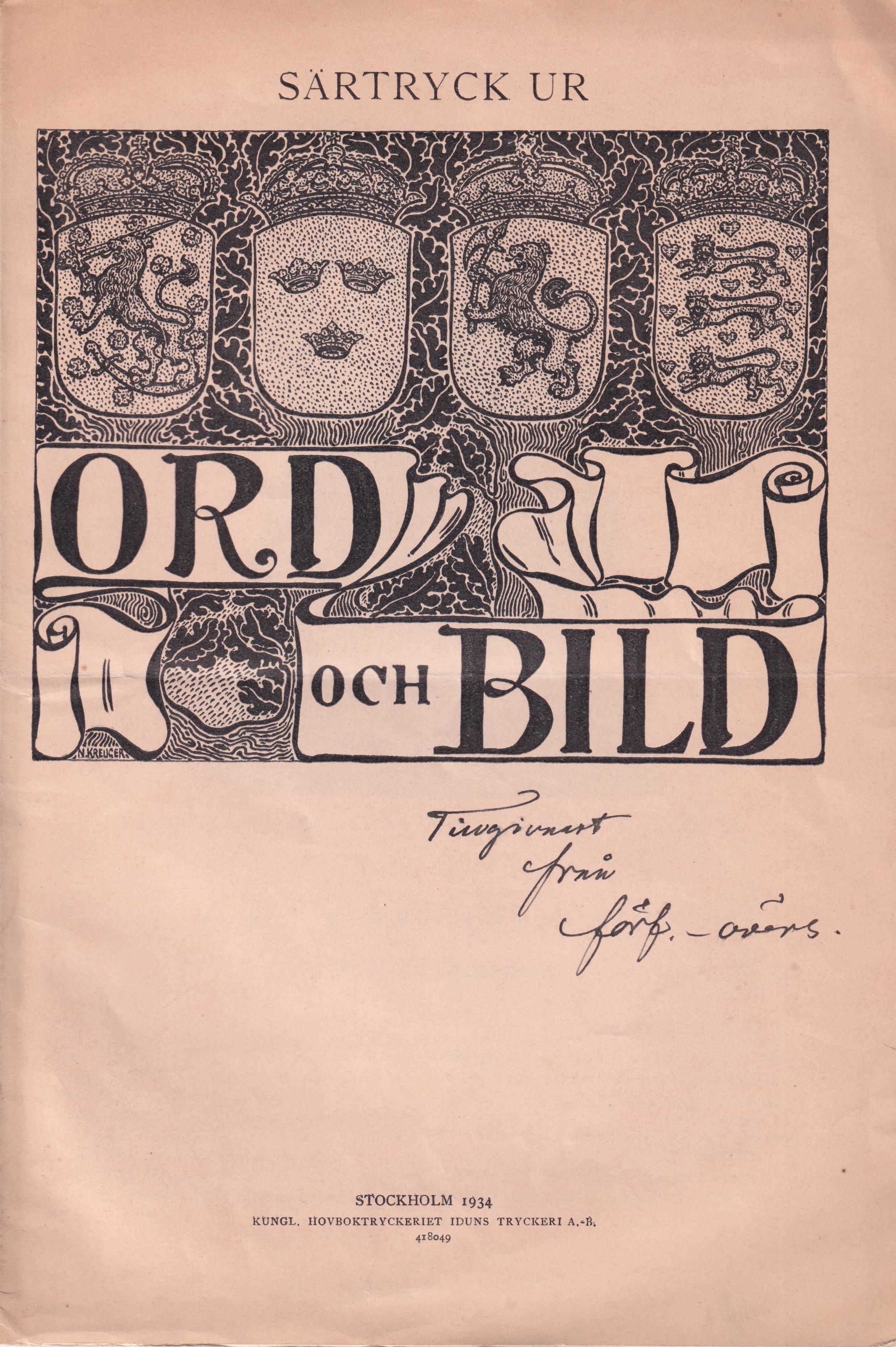 Stockholm, Kungl. Hovboktryckeriet Iduns Tryckeri-A.-B., 1934. 8:o. s. 491-495. Limhäftad med styvt tryckt pappersomslag. Tvärgående vikmärke. Tillskrift ‘Tillgivnast / från förf. - övers.’ på främre omslaget. Ur Claes Westerlunds boksamling.
