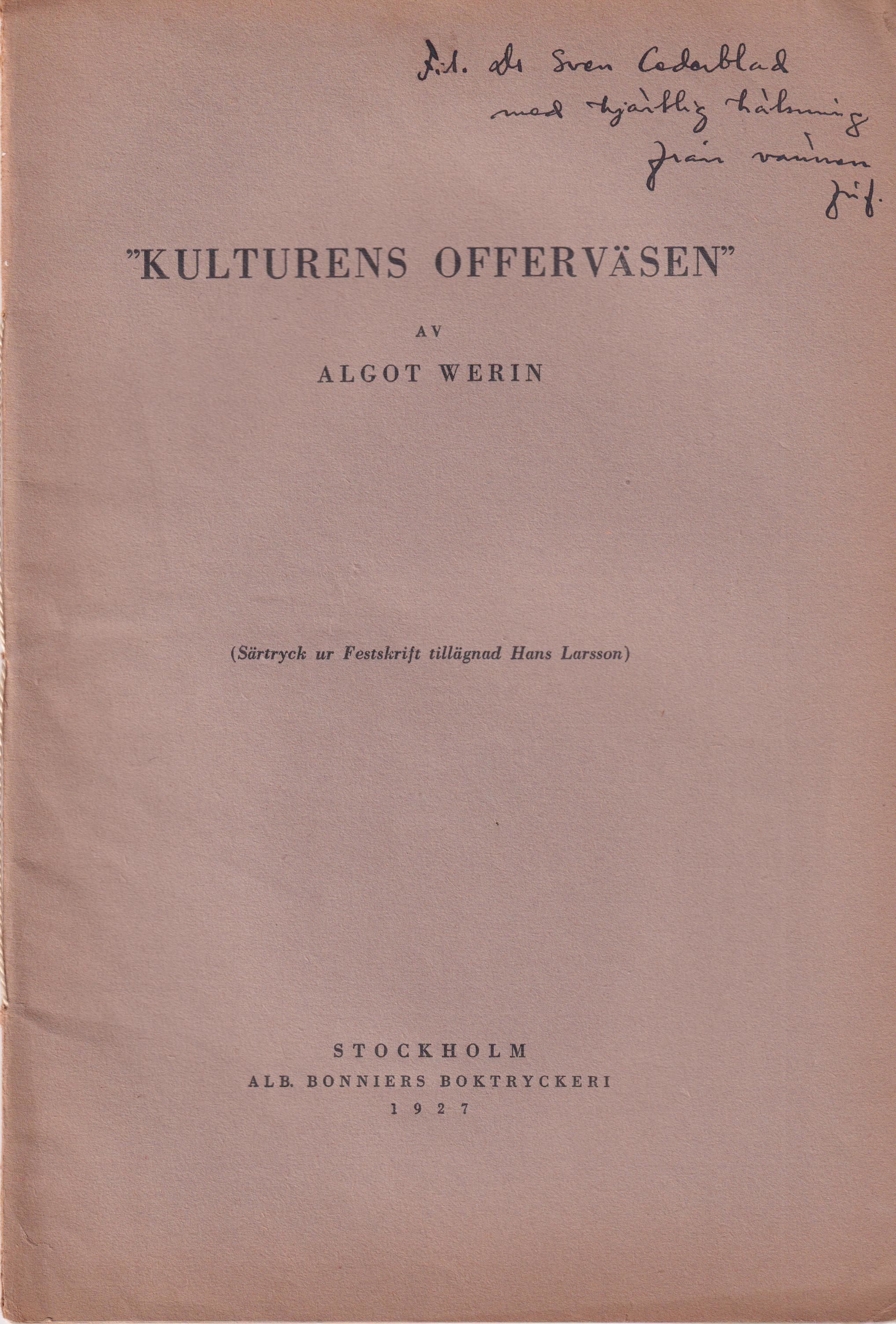 Stockholm, Alb. Bonniers Boktryckeri, 1927. 8:o. (1) s., s. 341-354. Snörhäftad med styvt tryckt brunt pappersomslag. Övre yttre hörn med svag fuktfläckTillskrift ‘Fil. Dr Sven Cederblad / med hjärtlig hälsning / från vännen förf.’ på främre omslaget. Ur Claes Westerlunds boksamling.